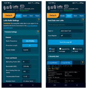 Po wywołaniu programu LS na ekranie komputera widoczny jest zielony przycisk „Connect” („Połącz”) – , a po udanym połączeniu z analizatorem jest on zastępowany przez pomarańczowy przycisk „Detach” („Rozłącz”). Użytkownik ma wówczas do dyspozycji cztery zakładki. Pierwsza z nich, pod nazwą „Radio”, służy do wprowadzenia parametrów transmisji: częstotliwości pracy, szerokości pasma rozproszonego sygnału, współczynnika rozpraszania, stopy korekcji, mocy nadajnika i innych. Użytkownik może (po naciśnięciu przycisku„User Settings” na ekranie) zapisywać własne profile zawierające potrzebne mu zestawy parametrów, przykładowo dla sieci Meshcom, LoRaAPRS itd., lub je wywoływać.